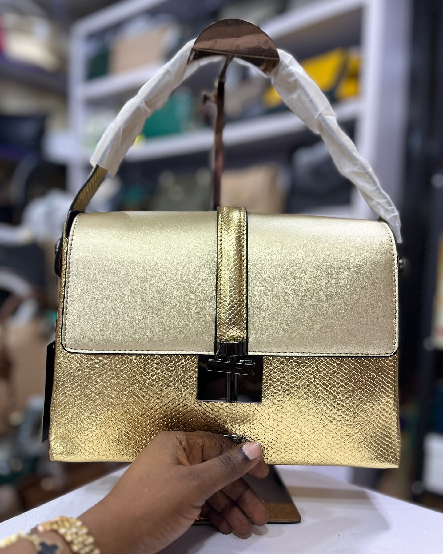 Glimmer & Texture: Metallic Gold Dual-Finish Handbag Make a bold statement with this luxurious gold handbag, featuring a sophisticated blend of smooth metallic and exotic snake-skin embossed textures. Designed with a sleek structured silhouette and a modern T-bar clasp, it’s the ultimate accessory for the woman who loves to shine.