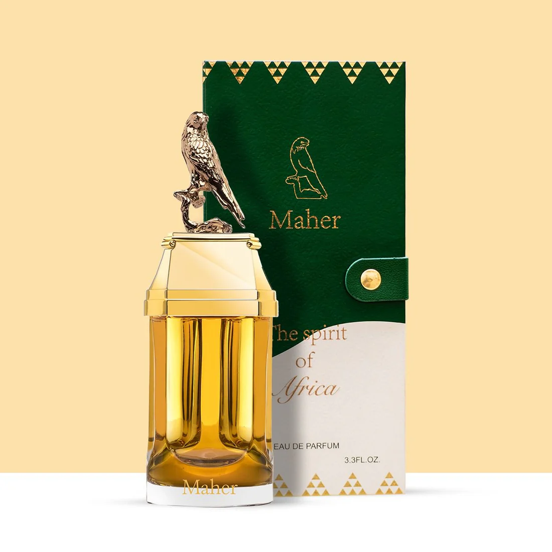 Maher: The Spirit of Africa, a captivating and exotic Floral Fruity fragrance with deep woody undertones. This Eau de Parfum opens with a vibrant, sun-drenched explosion of pink grapefruit, black currant, and wild strawberry, evoking the freshness of the savannah at dawn. The heart reveals an elegant floral sanctuary of rose and violet, balanced by a refined core of rich spices and earthy vetiver.