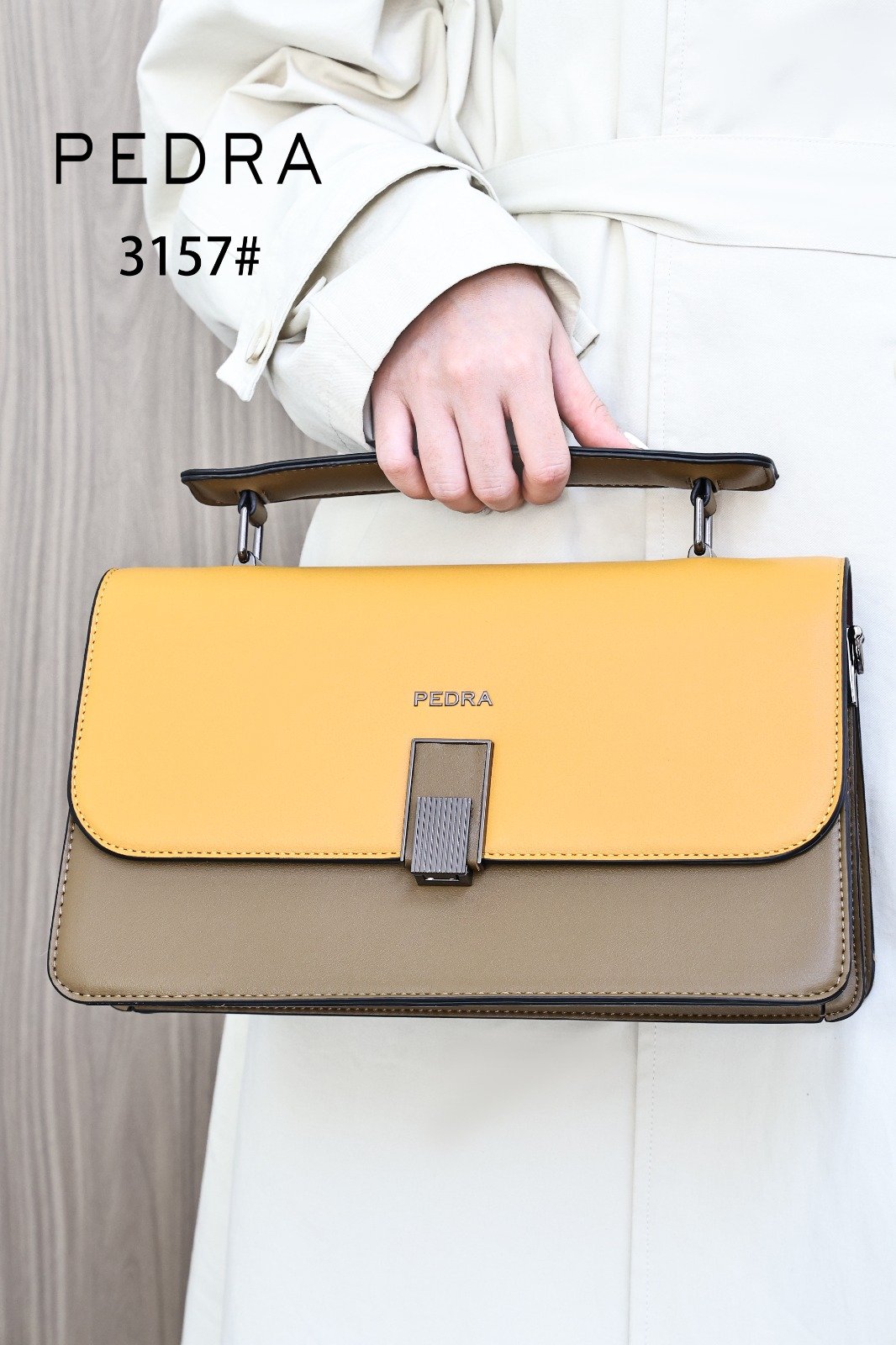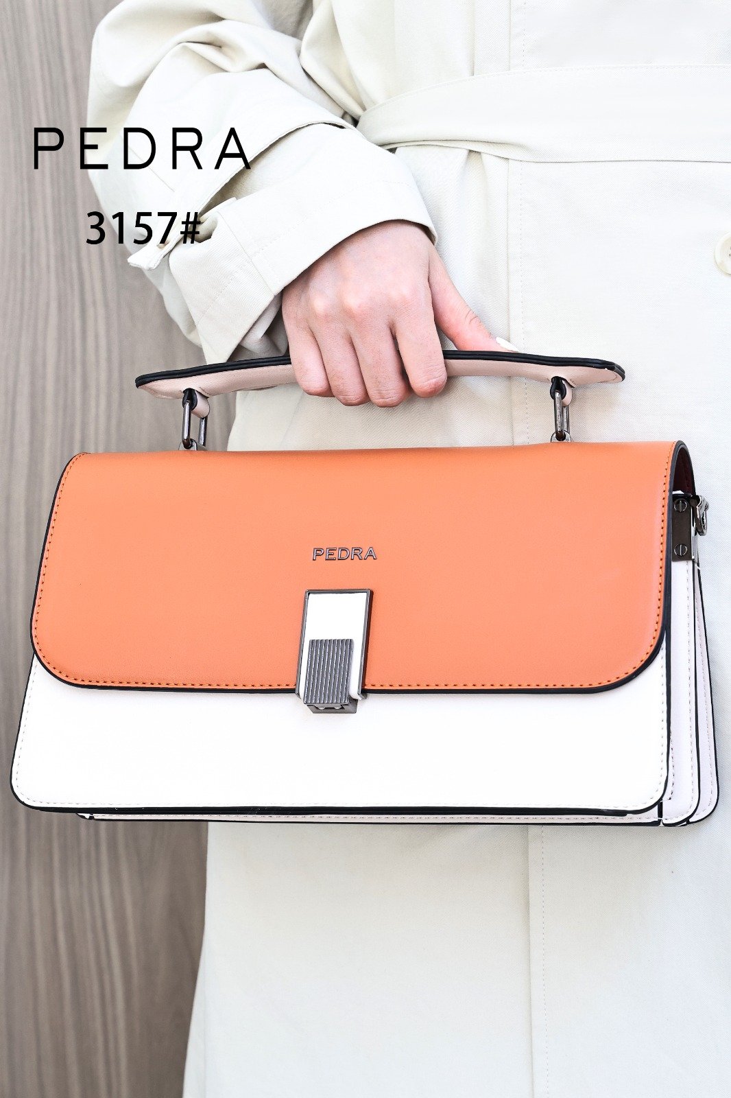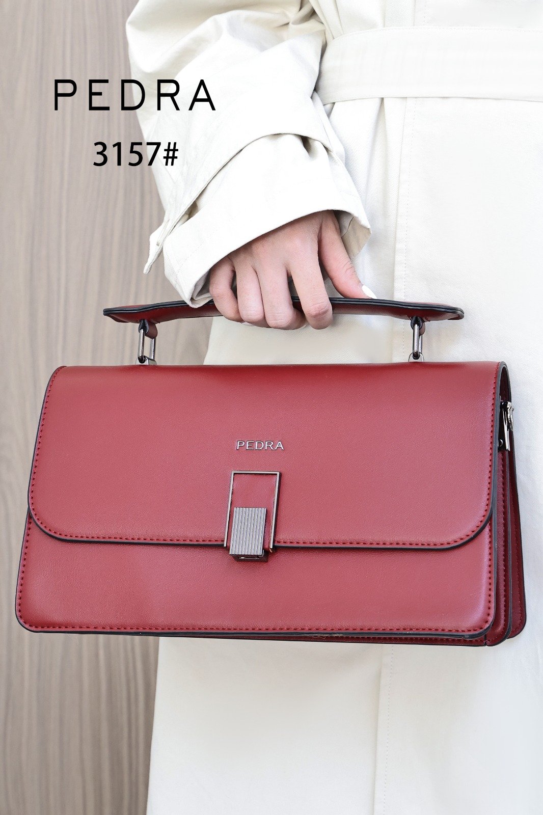 • Hardware: Includes a small, vertical rectangular metal clasp on the front flap and “PEDRA” branding in silver-tone lettering.