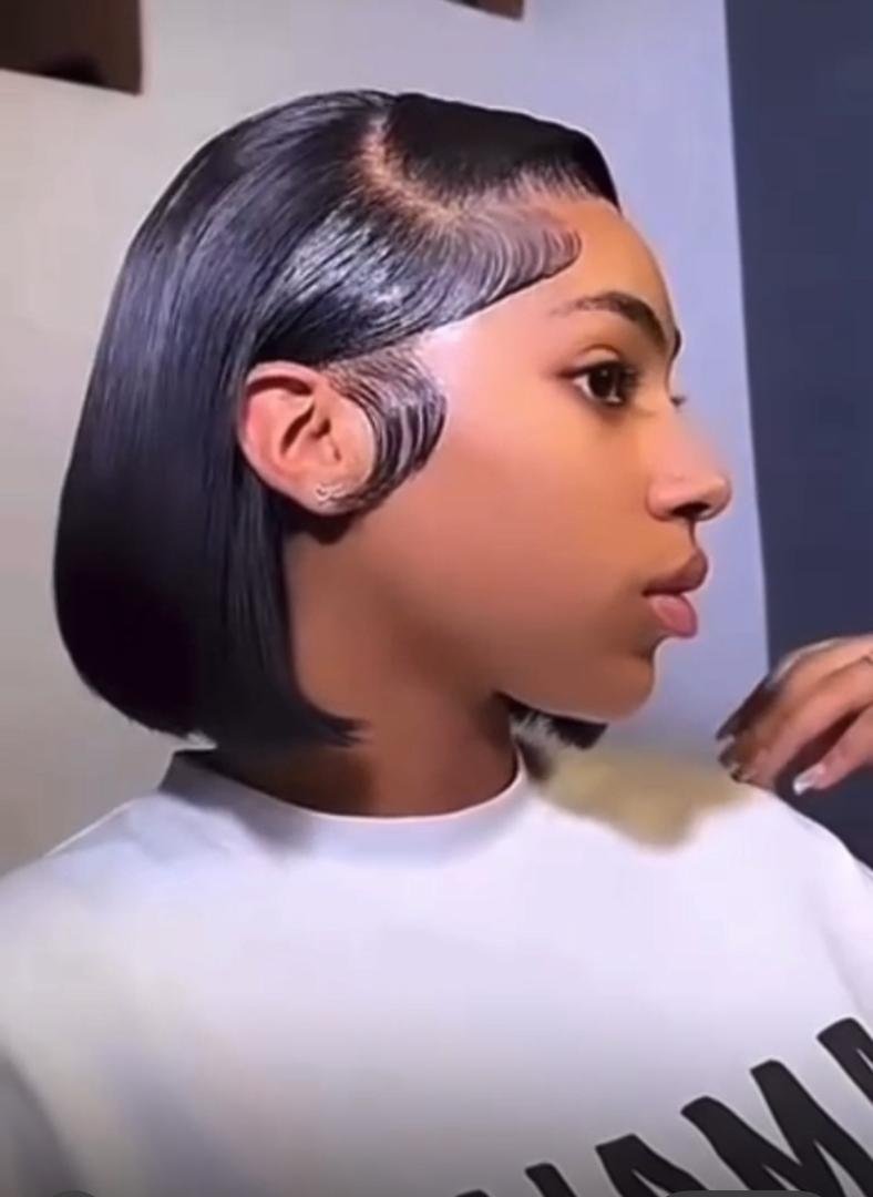 Experience the pinnacle of sleek styling with our Luxe Noir Bob. This unit is expertly crafted to provide a flawless, mirror-like finish. The highlight of this piece is the pre-customized hairline, designed to allow for the intricate, swooping edge work seen in the image.